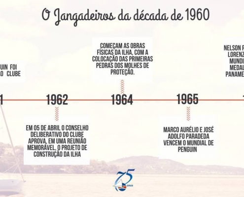 Se os anos 1950 foram marcados pelas primeiras conquistas nacionais do Clube dos Jangadeiros e a organização do primeiro Campeonato Mundial de Snipe do Hemisfério Sul, a década de 1960 ficou para história com o início da construção da nossa Ilha. Não que os títulos brasileiros e internacionais tivessem cessado. Pelo contrário, nossos atletas continuavam subindo no lugar mais alto do pódio.