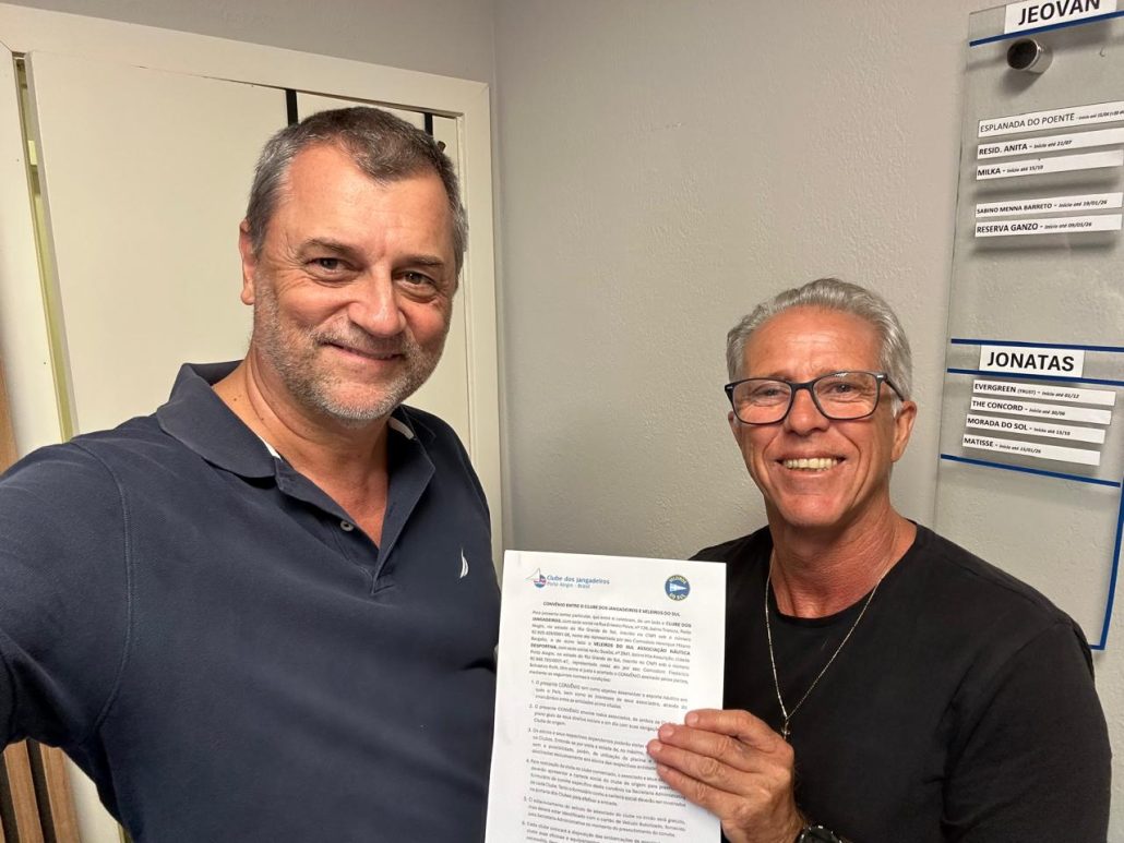Na última segunda-feira (9), o Comodoro do Clube dos Jangadeiros, Henrique Bergallo, reuniu-se com o Comodoro do Veleiros do Sul, Frederico Roth, para formalizar e atualizar o convênio de reciprocidade entre os dois tradicionais clubes náuticos de Porto Alegre.
