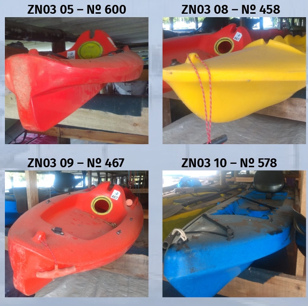Se tratam de quatro caiaques, dois na cor vermelha, um azul e outro amarelo.