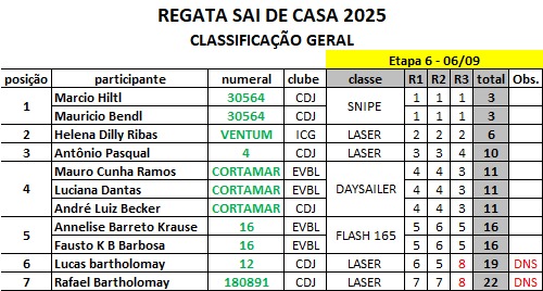 A 6ª edição da Regata Sai de Casa 2025, promovida pela Escola de Vela Barra Limpa, foi realizada no último sábado (6) no Clube dos Jangadeiros. Onze velejadores, entre alunos da EVBL, associados do Jangadeiros e do Iate Clube Guaíba, competiram em 7 barcos das classes Snipe, Laser, Daysailer e Flash 165. Ao total, foram realizadas três regatas.