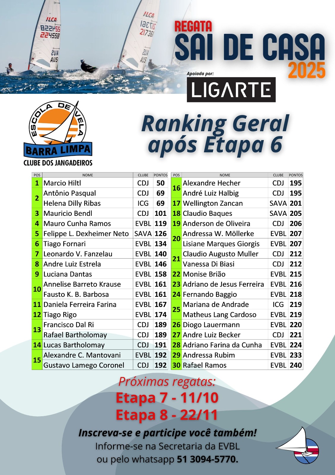 Os campeões do ranking, ao final do ano, serão os velejadores que mais participarem e também os que somarem as melhores colocações. Faltam duas etapas para o fim do campeonato. A etapa 7 será em 11 de outubro e a 8, em 22 de novembro.