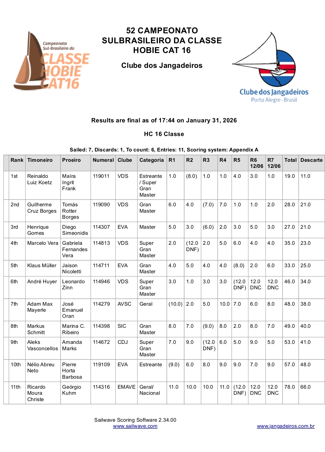 Encerrou-se neste sábado o Campeonato Sul-brasileiro de Hobie Cat 16, realizado no Clube dos Jangadeiros. A cerimônia de premiação foi ao final da tarde, na Escola de Vela Barra Limpa.
