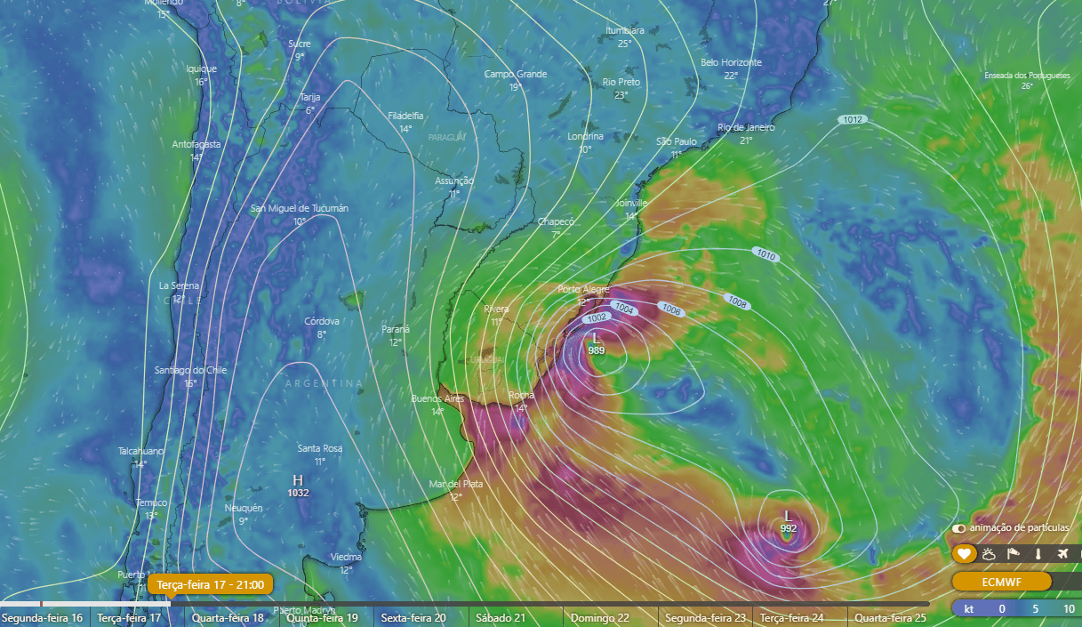 O ciclone, que deve adquirir características subtropicais, atinge o Sul do Brasil nesta terça-feira (17) e quarta-feira (18), passando pelo litoral gaúcho em direção à costa catarinense.