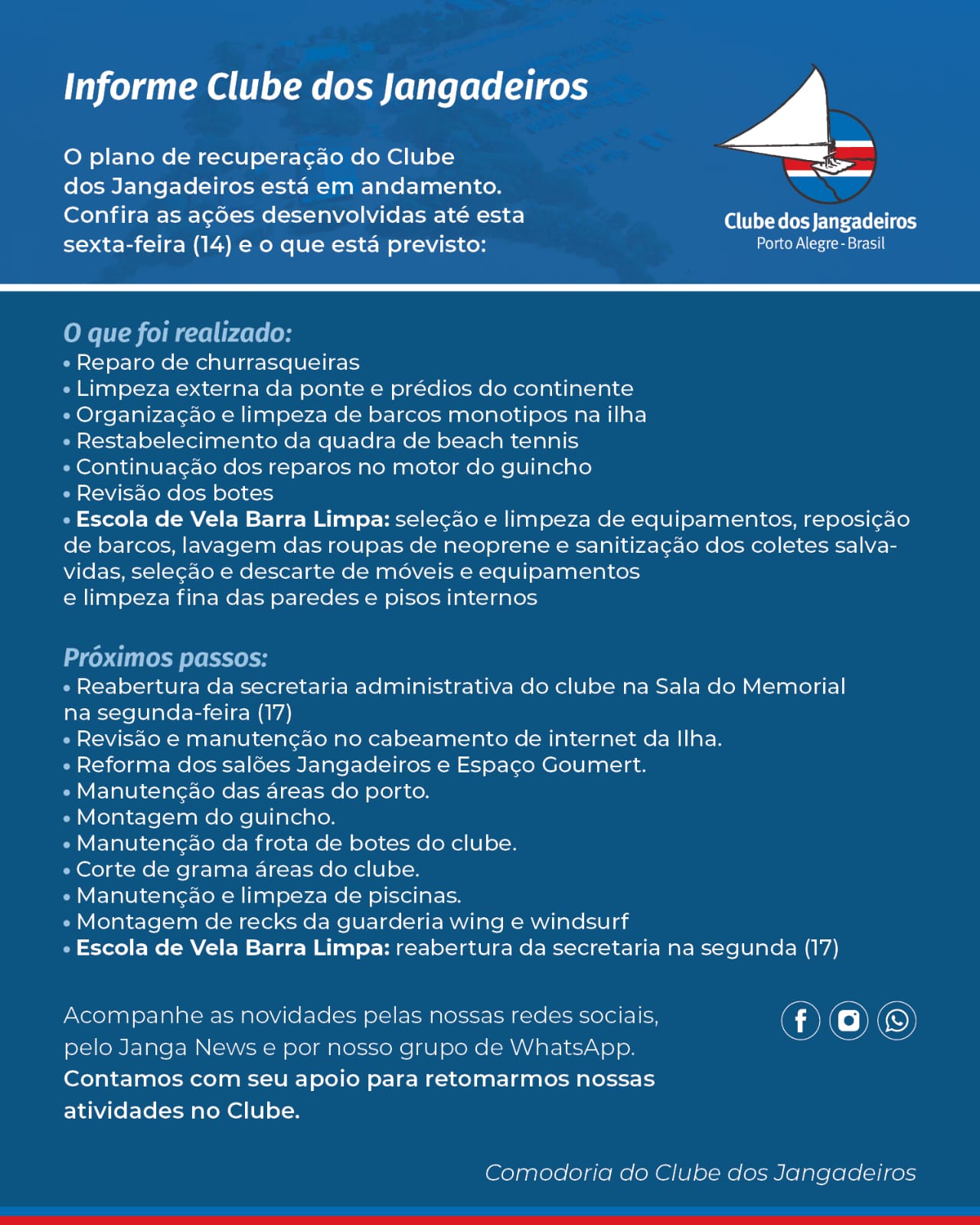 Com essas iniciativas, o Clube dos Jangadeiros busca garantir um ambiente mais seguro, organizado e acolhedor para os associados, evoluindo até o retorno pleno depois das enchentes que atingiram o Estado.