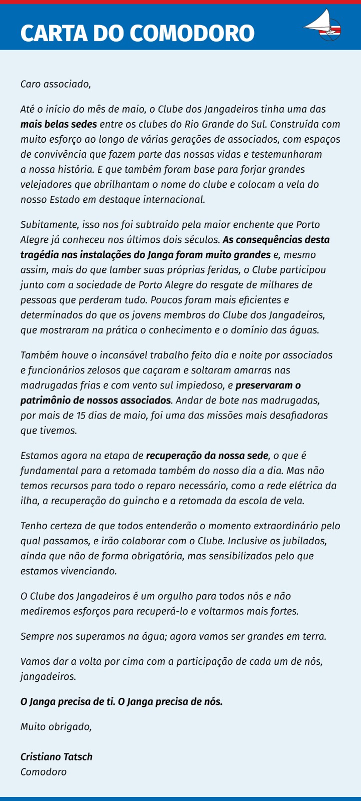 “A Comodoria fez um estudo amplo, detalhado e transparente das necessidades do Clube para que ele volte a ser o que tínhamos, com o mesmo apelo e facilidades que o Jangadeiros sempre ofereceu aos associados, que possuem ou não embarcação. Chegou a hora de darmos para o Jangadeiros um pouco do que ele deu para nós e continuará dando por muitos anos. Neste momento, o associado entrega suas obrigações mensais e um pouco mais para que o Janga volte a ser o paraíso dentro de Porto Alegre que ele sempre foi”, afirma Manuel Ruttkay Pereira, presidente do Conselho Deliberativo.