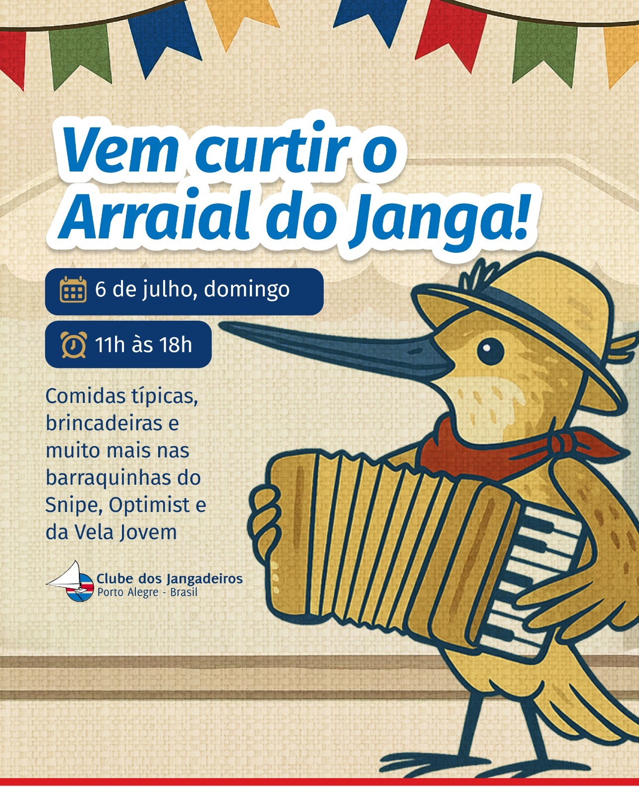 Esperamos por você neste domingo (6), das 11h às 18h, para aproveitar uma tarde repleta de diversão no nosso Arraial do Janga. As barraquinhas do Snipe, Optimist e da Vela Jovem estarão cheias de delícias e atividades para todas as idades.