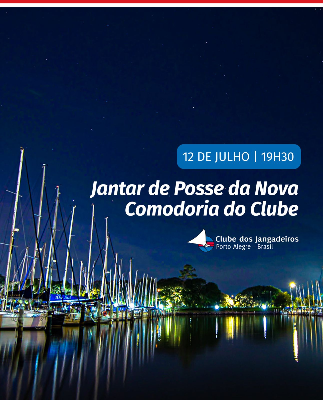 Os associados estão convidados para o jantar de posse da nova Comodoria do Clube dos Jangadeiros, que será realizado no sábado, 12 de julho, a partir das 19h30min.