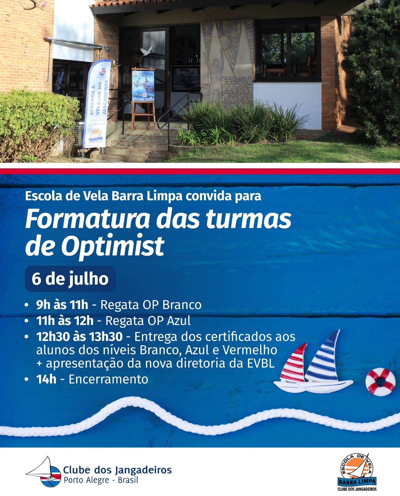 Os alunos que tiveram aulas de vela na Escola de Vela Barra Limpa no último semestre vão se formar neste domingo (6). A cerimônia está prevista para começar às 8h30min, com a apresentação dos instrutores e monitores da Escola de Vela Barra Limpa. Das 9h às 11h, ocorre a regata de Optimist do nível Branco. Já das 11h às 12h, será disputada a regata de Optimist do nível Azul.