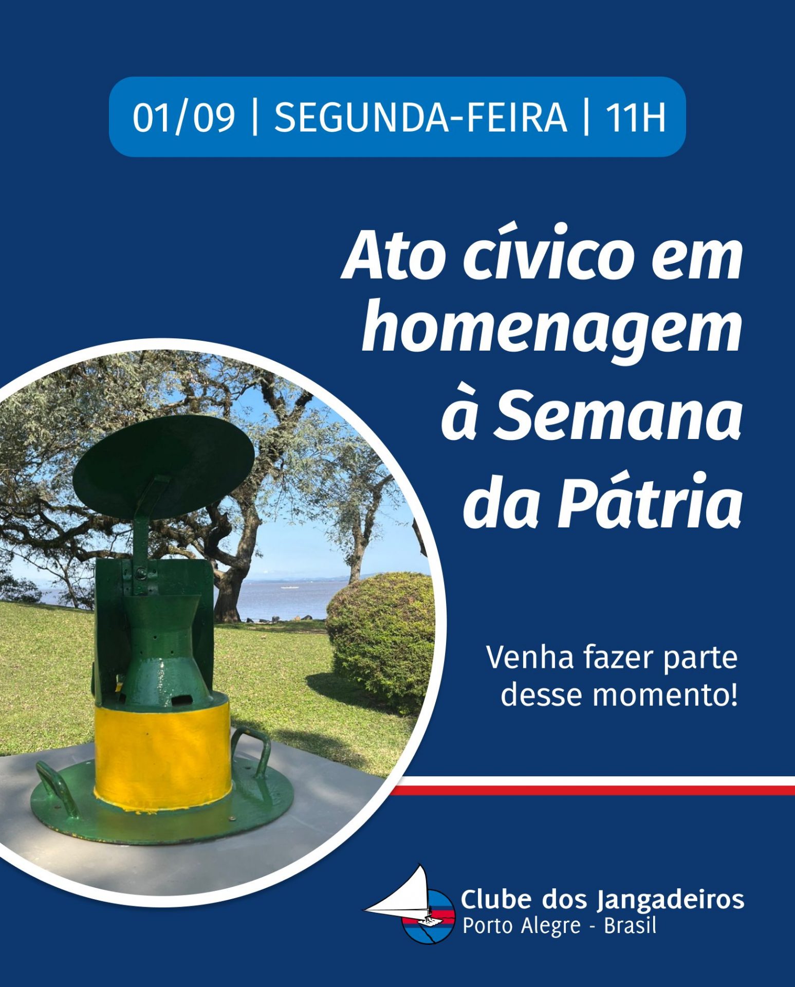 Na próxima segunda (1°), às 11h, na Ilha do Clube dos Jangadeiros, ocorrerá o acendimento da pira com o Fogo Simbólico, em homenagem à Semana da Pátria. O fogo estará no Monumento ao Expedicionário (Parque Farroupilha) e será levado pelos atletas em corrida de revezamento do Pontal do Estaleiro até o Clube dos Jangadeiros, onde está localizada a pira. Contaremos com a presença da Banda da Brigada e dos Escoteiros do Mar, além da sua!