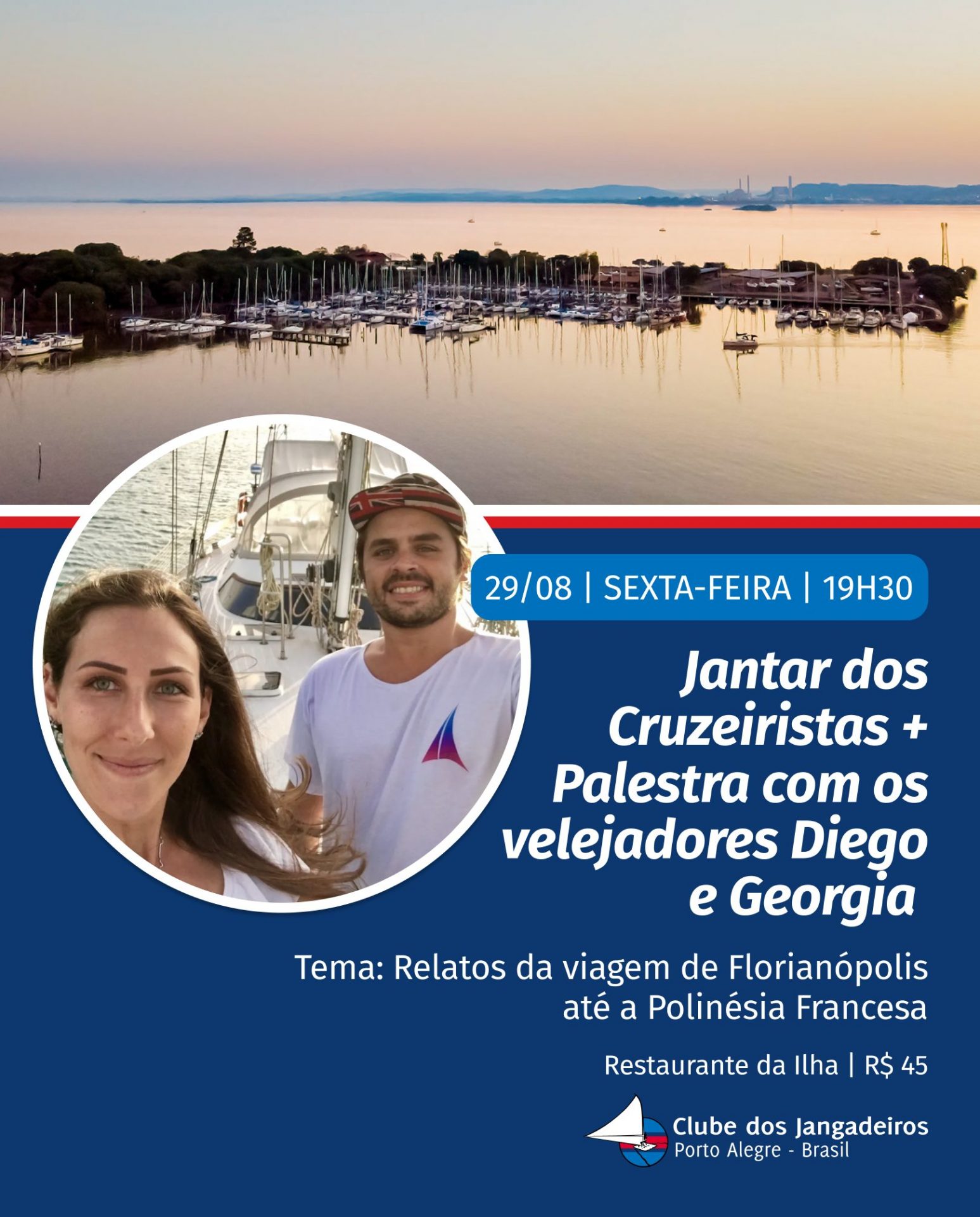 Nesta sexta-feira (29), às 19h30, no Restaurante da Ilha, Diego e Georgia, donos do canal do Youtube “unforgettablesailing”, vão fazer uma palestra sobre o trajeto náutico que realizaram de Florianópolis até a Polinésia Francesa. O evento é aberto a todos os associados do Clube, mediante reserva pelo WhatsApp do restaurante: 51 8654-7267. O valor do jantar é de R$45. Restam poucas vagas!