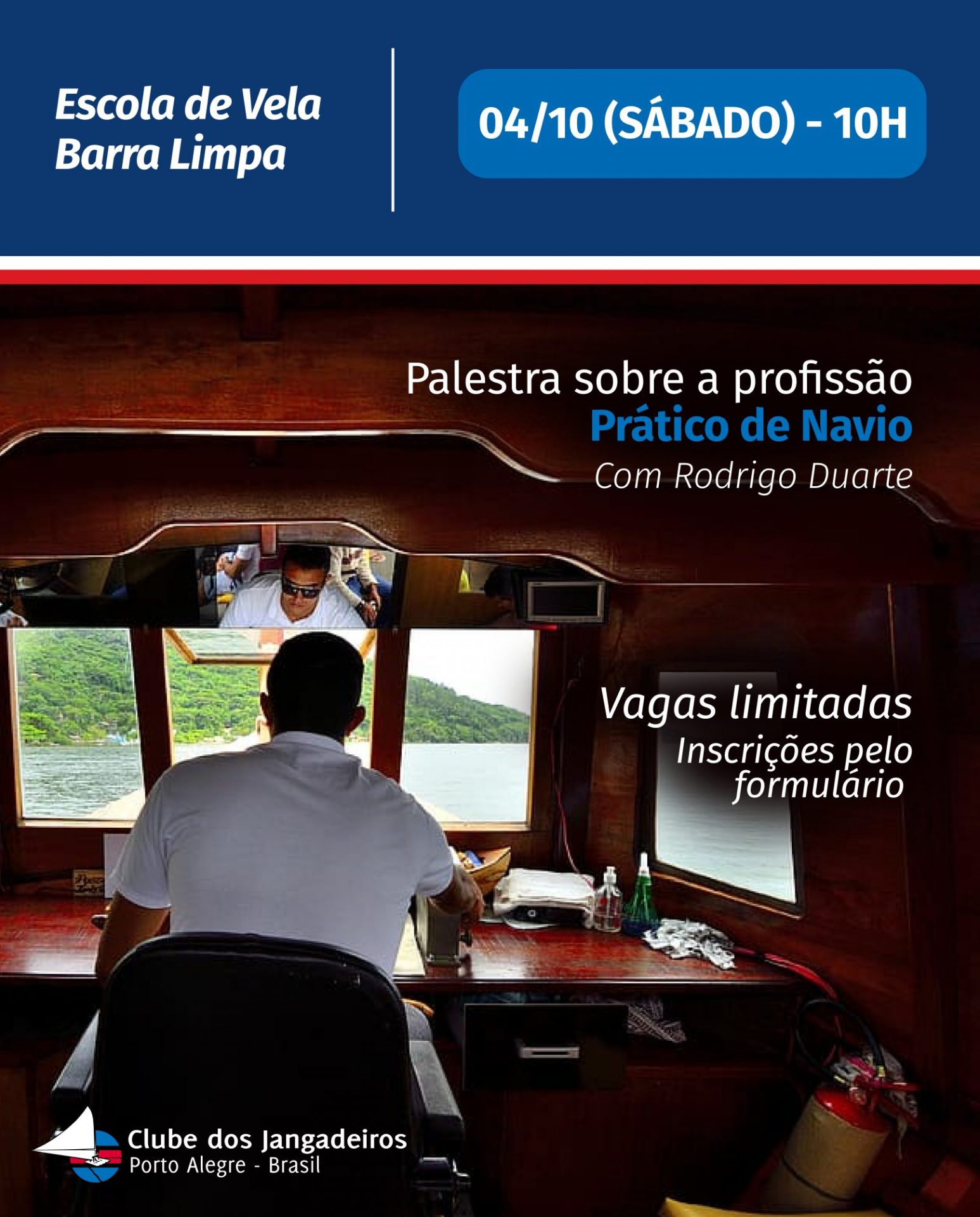 Por trás de cada atividade portuária, existe um profissional que assessora os navios e garante a segurança na logística de manobras de atracação e desatracação. É uma atividade importante que garante os fluxos de transporte nos portos, além da atuação em áreas de navegação restrita. Para conhecer melhor a carreira de prático de navio e as etapas de formação, convidamos você para assistir a palestra do profissional Rodrigo Duarte, no dia 4 de outubro (sábado), na Escola de Vela Barra Limpa, às 10h. Inscreva-se pelo formulário https://tinyurl.com/Pratico-navio e não perca!