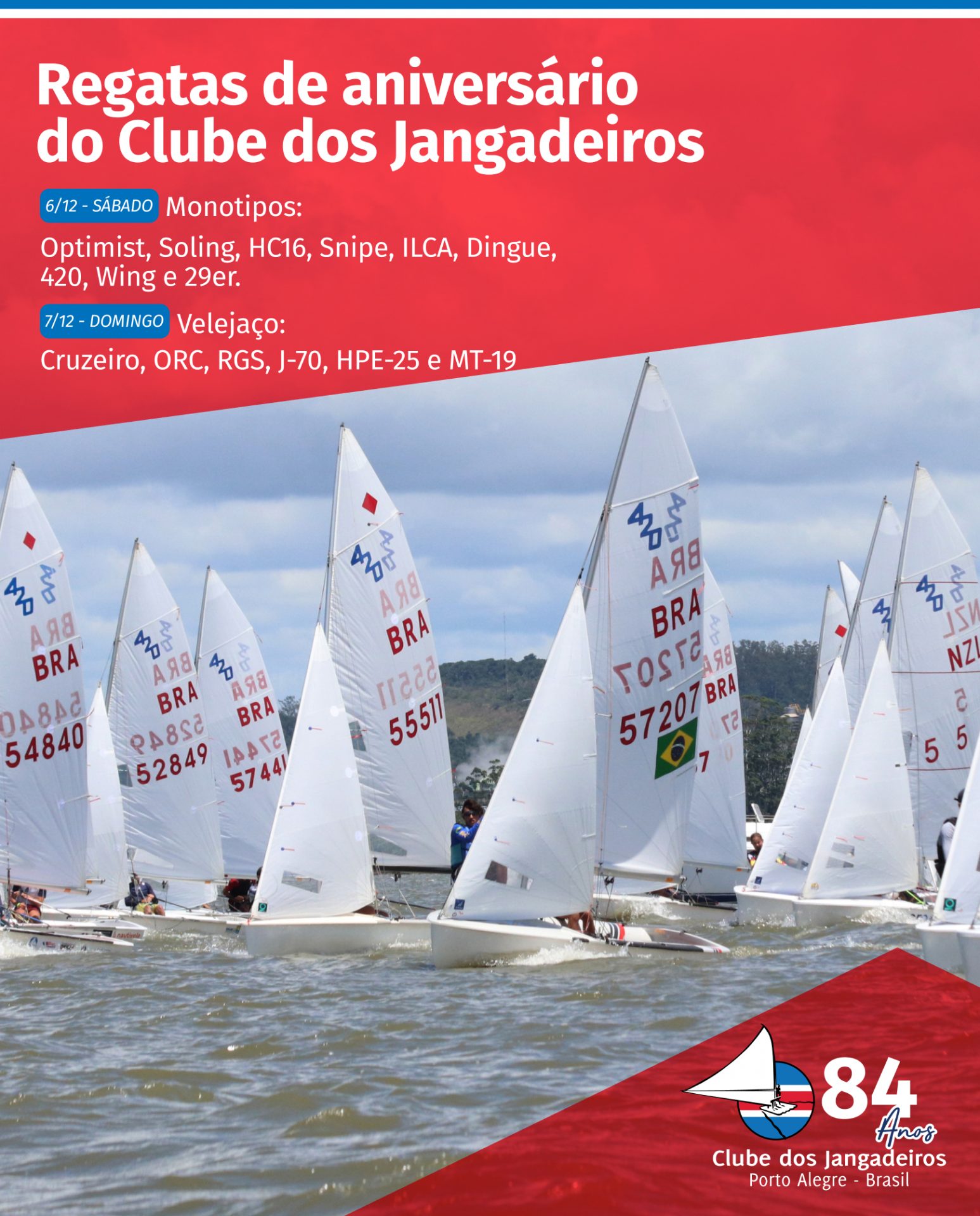 Para completar as comemorações do aniversário do Clube, realizaremos as Regatas de Aniversário neste final de semana (6 e 7). O sábado (6) é dia de Monotipos: Optimist, Soling, HC16, Snipe, ILCA, Dingue, 420, Wing e 29er. Já o domingo é dedicado ao Velejaço: Cruzeiro, ORC, J-70, HPE-25 e MT-19.
