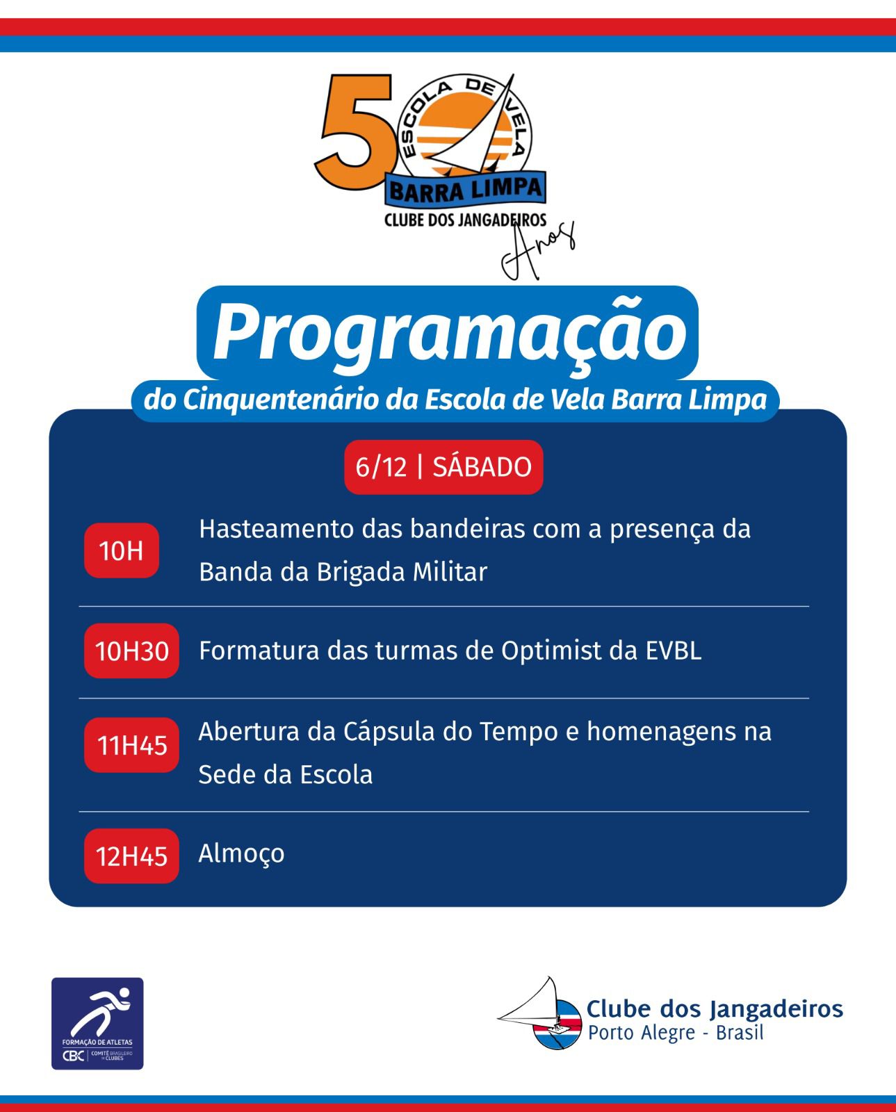 Também no dia 6 de dezembro (sábado), será celebrado o cinquentenário da Escola de Vela Barra Limpa. Em comemoração a esta data, montamos uma programação especial para você e sua família com uma grande surpresa: a abertura da Cápsula do Tempo, que foi enterrada na Escola há cinco décadas. Confira a programação: