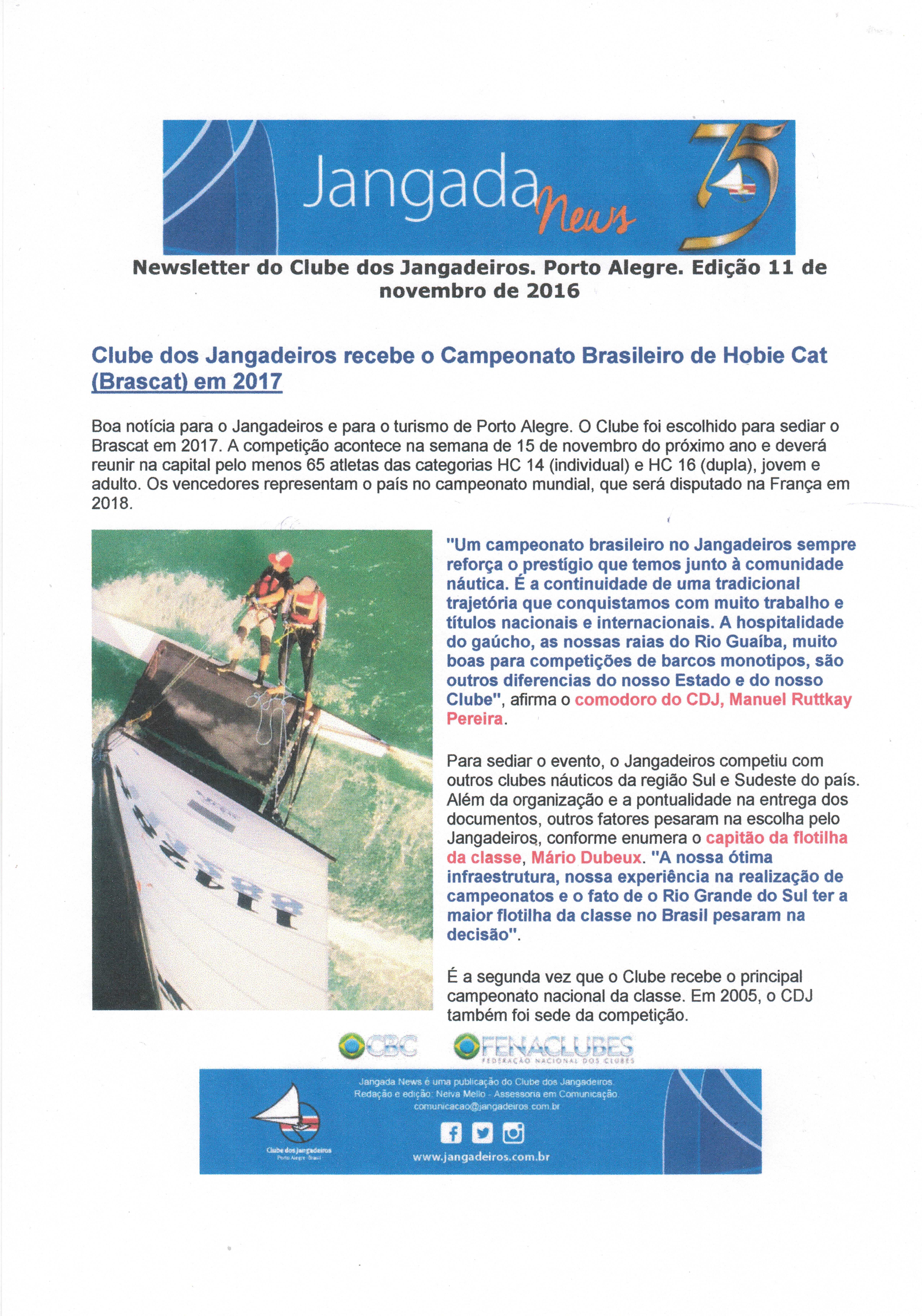 Newsletter do Clube dos Jangadeiros. Porto Alegre. Edição 18 de novembro de 2016