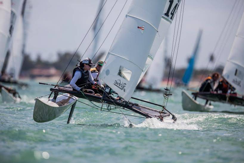 A disputa segue acirrada no Campeonato Sul Americano de Hobie Cat 16. Neste sábado foram disputadas mais três regatas de um total de oito que serão realizadas em Maria Farinha, litoral norte de Pernambuco. Após seis regatas, Karoline Bauermann (CDJ) e Maria Inês Vera (Sava) seguem na liderança na classe feminina. A dupla se manteve em primeiro lugar após vencer a última regata de sábado. Em segundo lugar e empatada com as lideres aparecem Michelle Oliveira e Marilia Gomes Bassoa, do Veleiros do Sul.