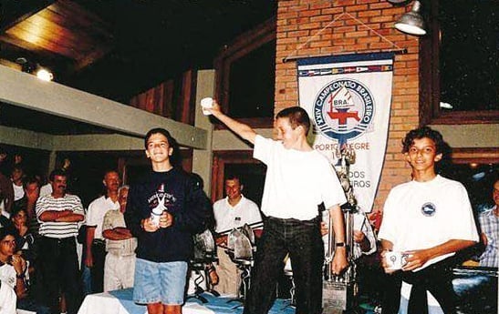 Na foto, o pódio gaúcho na competição, com uma dobradinha do Jangadeiros nas duas primeiras colocações. O título do campeonato ficou com Frederico Plass Rizzo. Beto Paradeda foi o vice-campeão e em terceiro lugar ficou André Streppel, do Veleiros do Sul.
